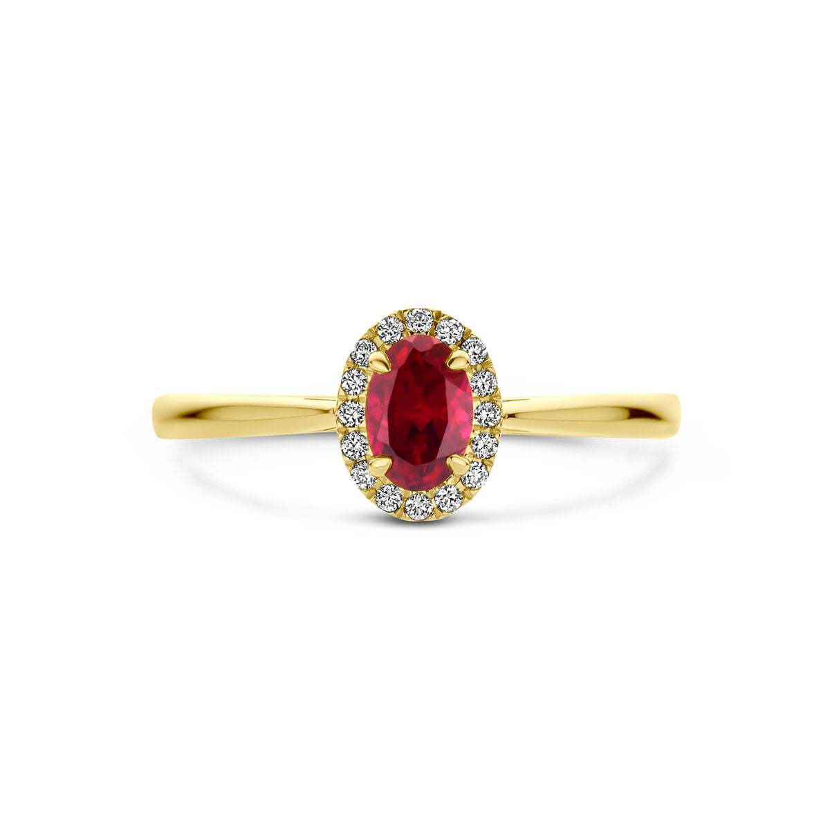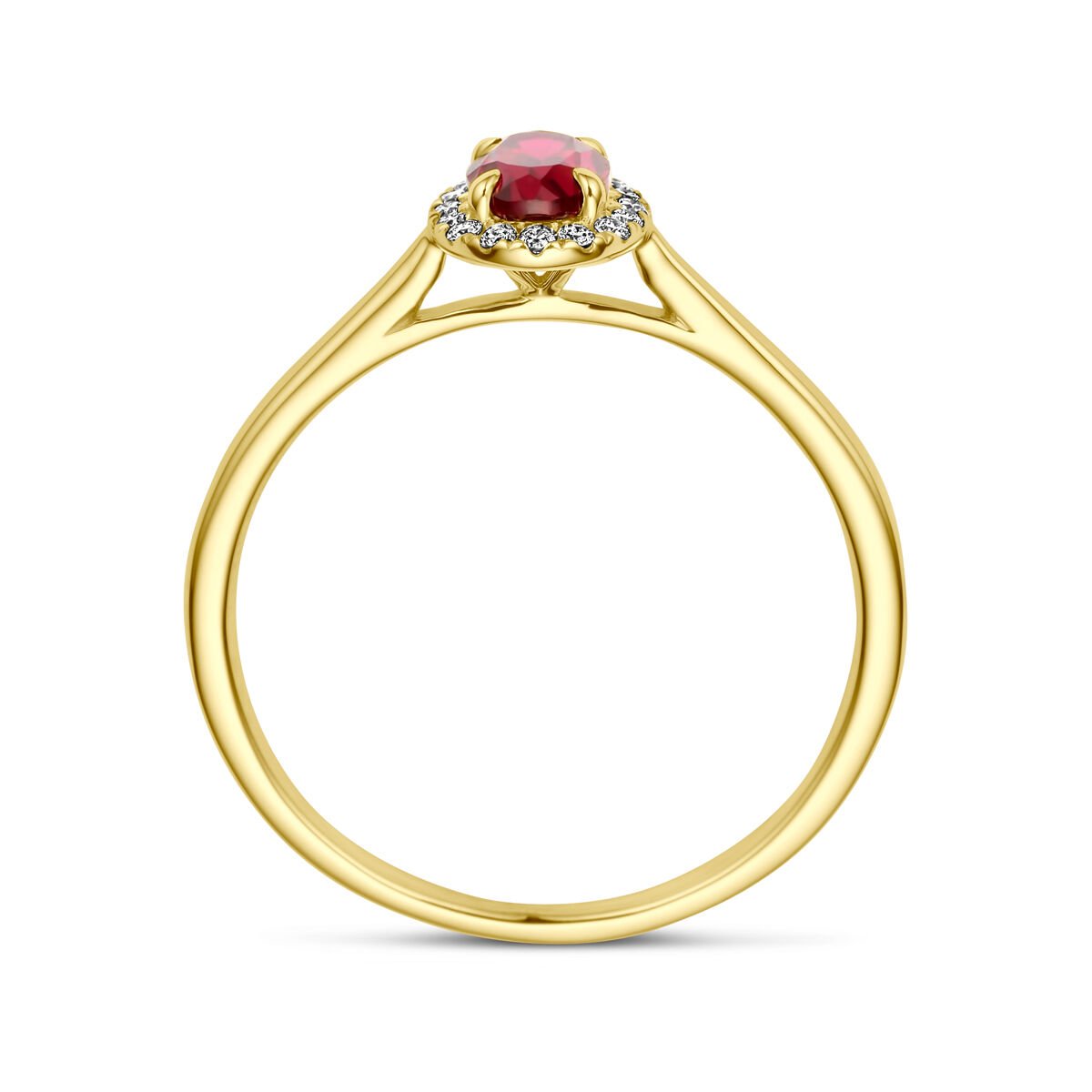 14k Geelgouden ring uitgevoerd met lab grown robijn en lab grown diamanten. De ring heeft een afmeting van 8×6.5mm en het diamantgewicht is 0.075ct. Lab grown diamanten zijn diamanten die ontstaan in een laboratorium. Onder extreem hoge druk en temperatuur wordt het natuurlijk ontstaansproces nagebootst met als eindresultaat een diamant met dezelfde chemische eigenschappen maar met een andere oorsprong.