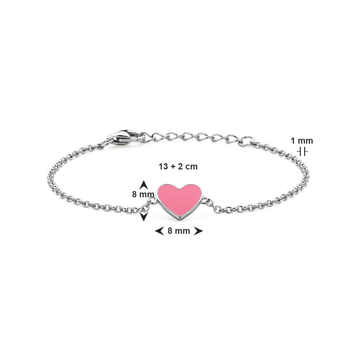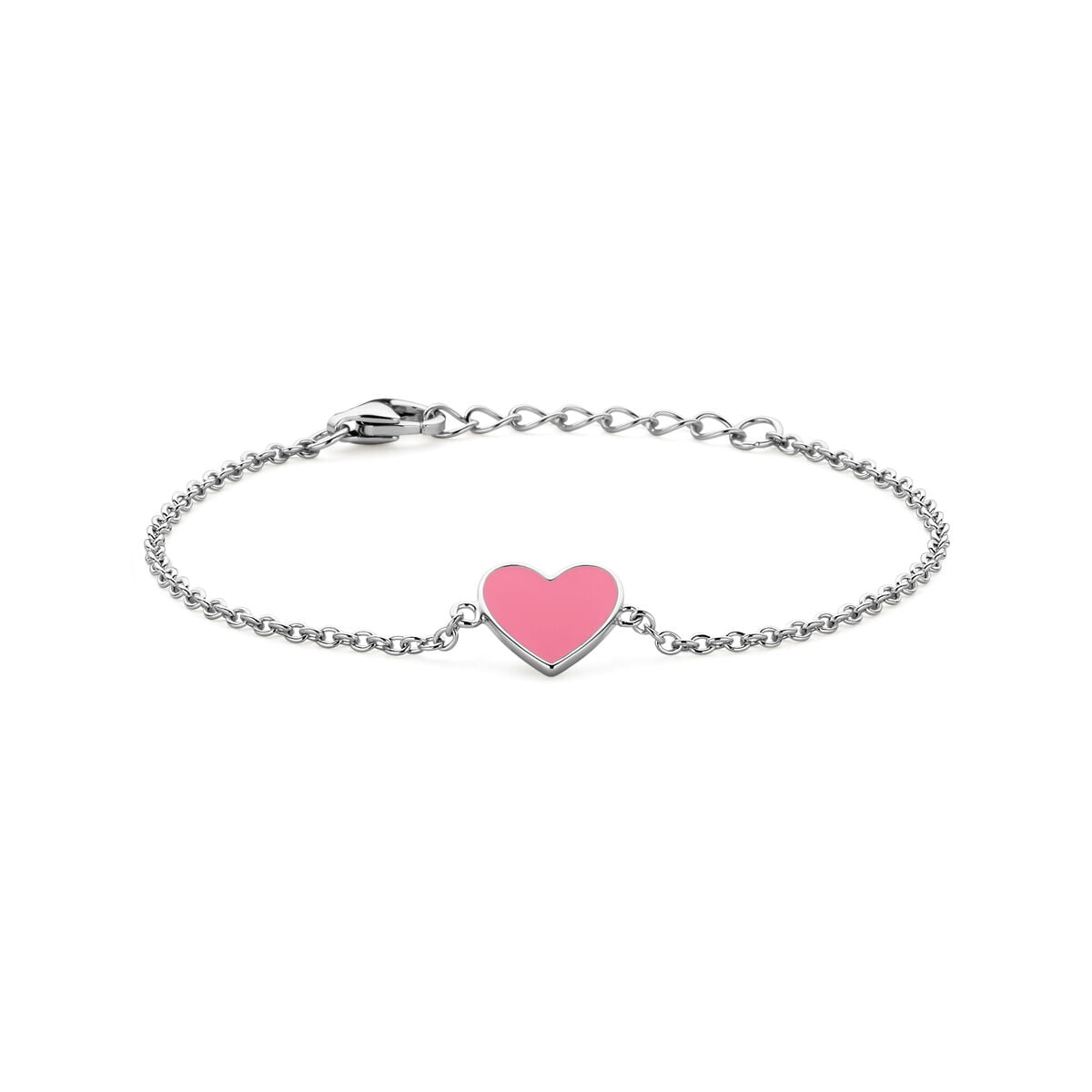 Gerhodineerd 925 zilveren armband uitgevoerd met een hart en roze emaille. De armband heeft een draaglengte van 13cm met 2cm extensie. Uitgevoerd met karabijn sluiting. De schakelbreedte is 1mm.