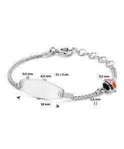 Gerhodineerd 925 zilveren graveerarmband uitgevoerd met een lieveheersbeestje. De armband heeft een draaglengte van 11cm en een extensie van 2cm. De schakelbreedte is 1.6mm. De graveerplaat heeft een dikte van 0.5mm.