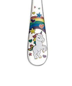 Kinderbestek van hoogwaardig 18/10 RVS met de afbeelding van een unicorn. De set is vaatwasmachinebestendig en bestaat uit een vork, mes, lepel en paplepeltje. De eerste hapjes waren nog nooit zo leuk!