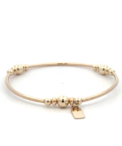 Elastische armband met goudkleurige ronde kralen, wieltjes en drie goudkleurige staafvormige bedeltjes.